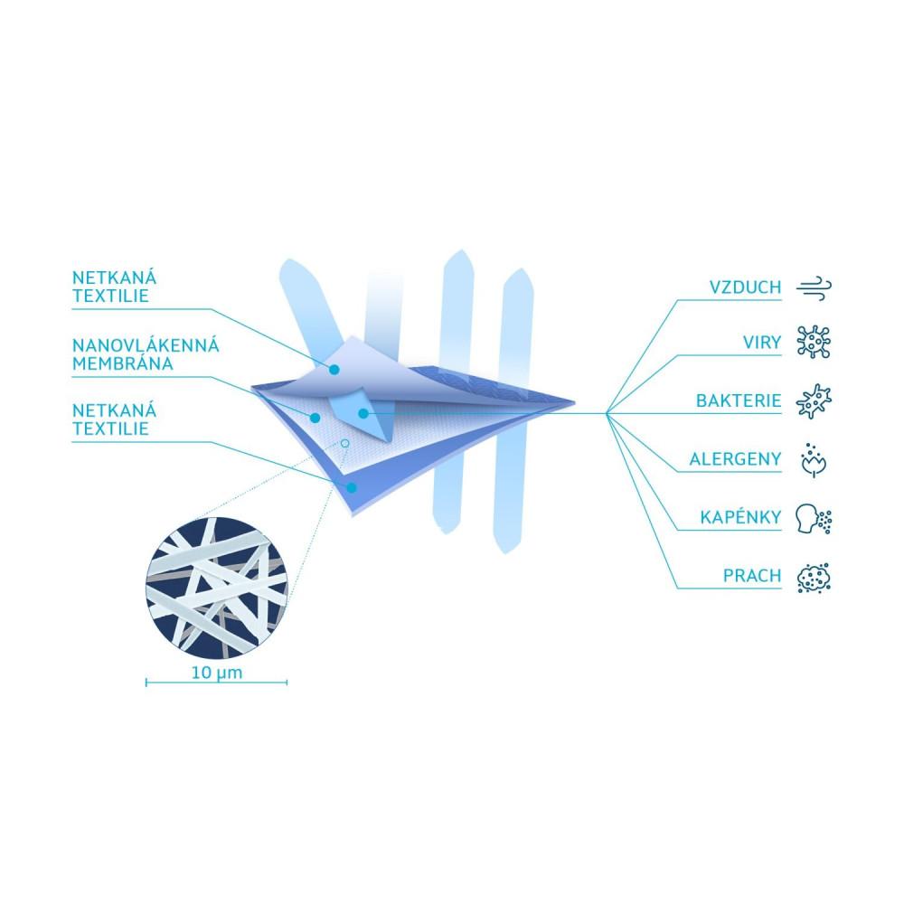 - Dvě plně prodyšné vrstvy netkané textilie mezi sebou jako sendvič chrání nanovlákennou membránu, která je natolik výkonná, že zadrží viry, bakterie, alergeny, kapénky i prach před proniknutím do dýchacích cest.