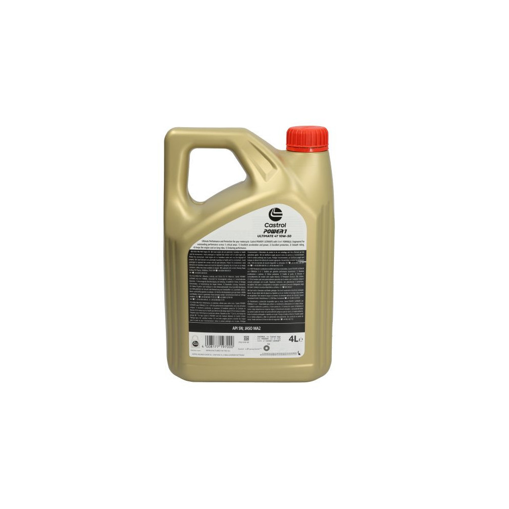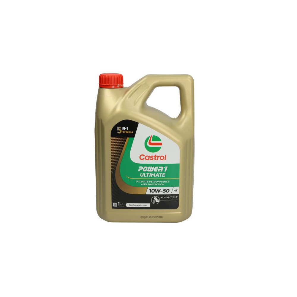 Castrol POWER 1 ULTIMATE (Racing) 10W-50 4T je syntetický motorový olej pro čtyřdobé motory vysoce výkonných závodních motocyklů. Jeho složení zvyšuje akceleraci a výkon motoru a umožňuje rychlý přechod do vysokých otáček. „Race Derived Technology“, vyvinutá na základě dlouholetých zkušeností společnosti Castrol s testováním olejů na závodních strojích, přináší maximální výkon motoru bez jakéhokoli snižování životnosti motoru, což přináší nenahraditelnou výhodu oproti jiným typům olejů.