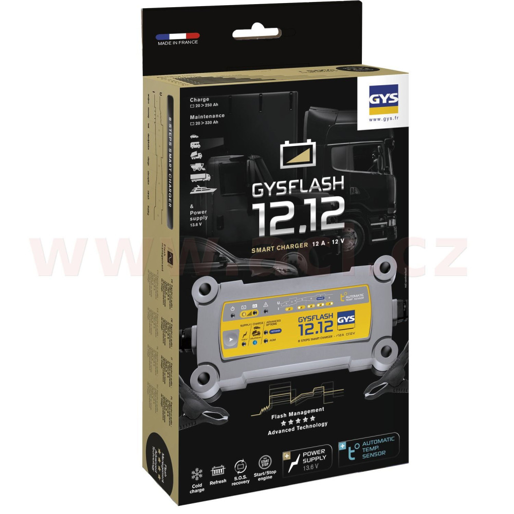 GYSFLASH 12.12 je speciálně navržen tak, aby nabíjel všechny typy 12V baterií v osobních automobilech, užitková vozidlech nebo nákladních automobilech. Nabízí 8-krokovou inteligentní křívku a režim «Supply» (napájení), pro napájení vozidla v showroomech.