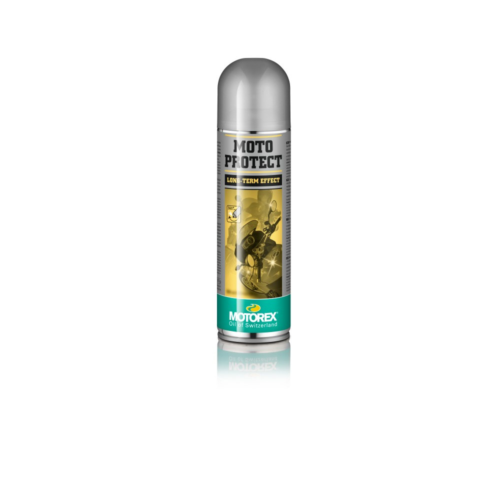 MOTOREX Moto Protect je ošetřující a ochranný prostředek ve spreji na kovové, chromované a lakované povrchy motocyklu. Dodává motocyklu lesk a vytváří tenký ochranný film, který odpuzuje prach a vodu. U tohoto prostředku stačí velmi malé stříknutí a rozleštit bavlněným hadříkem. Pozor, při aplikaci zakryjte brzdový kotouč, stupačky, sedadlo apod.