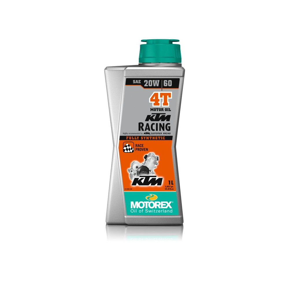 MOTOREX KTM RACING 4T 20W/60 je plně syntetický motorový olej určen pro čtyřtaktní vysoce zatížené závodní terenní motocykly cross a enduro KTM. Olej je speciálně vyvinut v úzké spolupráci KTM a MOTOREX pro spolehlivé mazání v extrémních teplotách při zachování střihové stability. Speciálně navržen pro nejnáročnější podmínky u cross a enduro závodních motocyklů KTM.