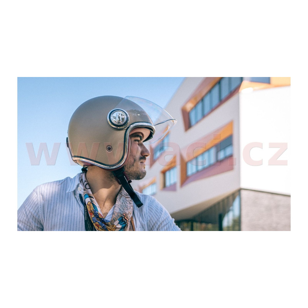 HERITAGE je otevřená přilba s plexi a se sluneční clonou, vyrobena v retro stylu s velkou dávkou preciznosti a přípravou pro sluchátka komunikátorů.
