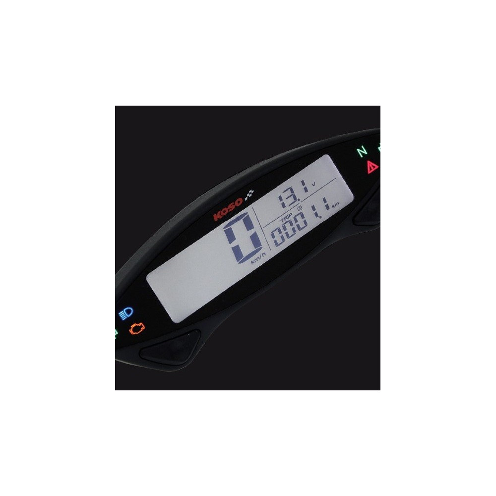 Univerzální multifunkční digitální tachometr s 6 kontrolkami, počítadlem denních a celkových najetých kilometrů, voltmetrem a hodinami. Součástí balení je kompletní montážní sada na řídítka. Tachometr je vybaven počítadlem provozních hodin. Celkový počet najetých kilometrů lze nastavit dle původního tachometru. Vhodný především pro cross a enduro, ale použitelný i na silniční motocykly nebo ATV.