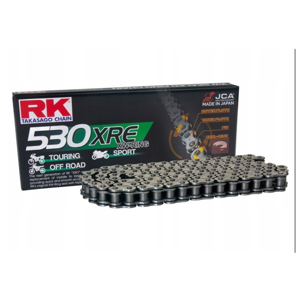 Řetězy RK XRE využívají nejmodernější technologie z mezinárodního silničního i off-road závodění. Nabízí špičkový výkon, vysokou odolnost a nízkou hmotnost pro rychlou a plynulou akceleraci.