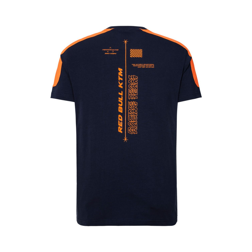 Fanouškovské tričko z oficiální kolekce KTM Red Bull Racing. Tmavě modré tričko s jedinečným potiskem KTM Red Bull Racing na zadní straně. Týmové logo i barvy.
